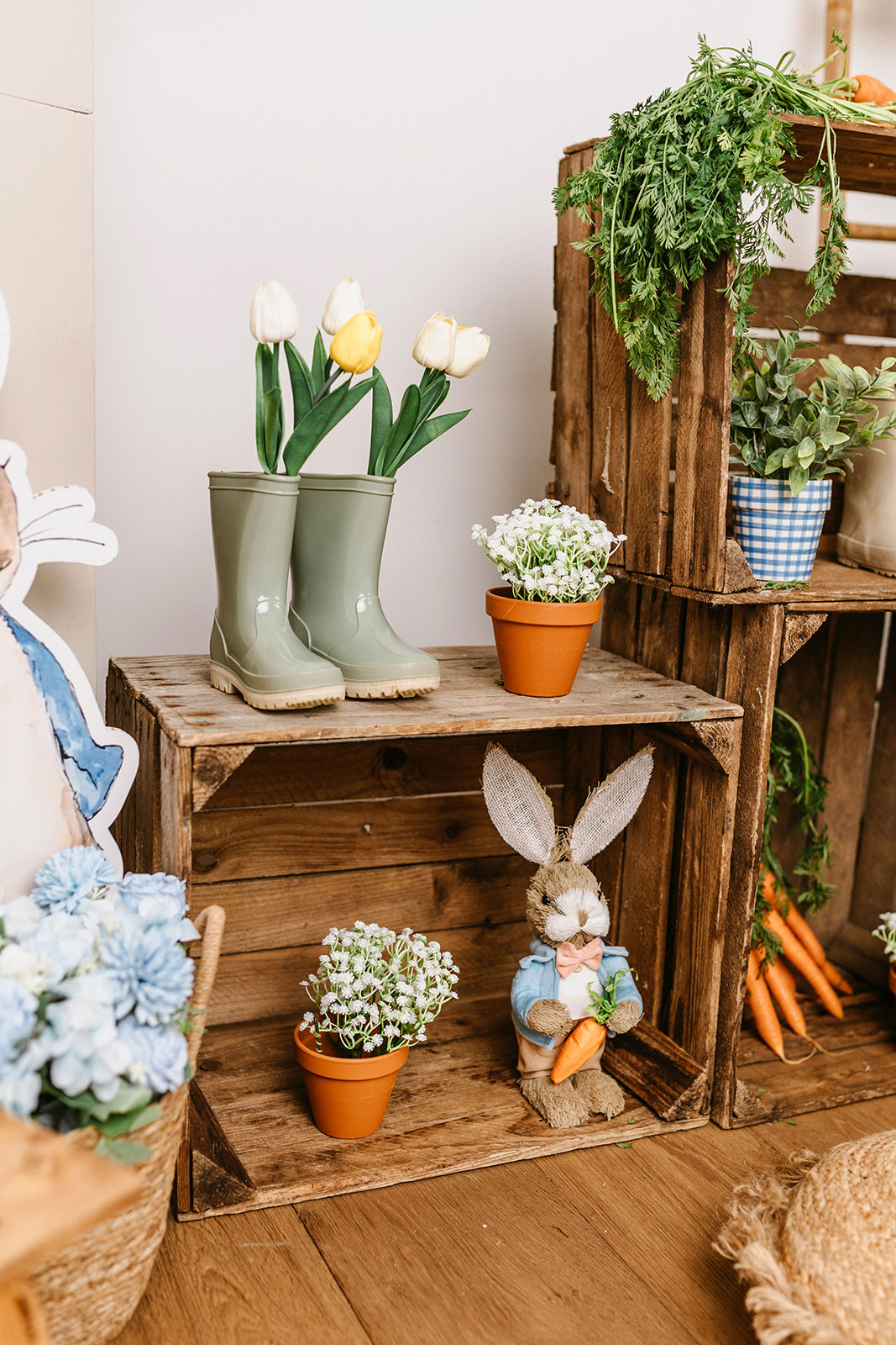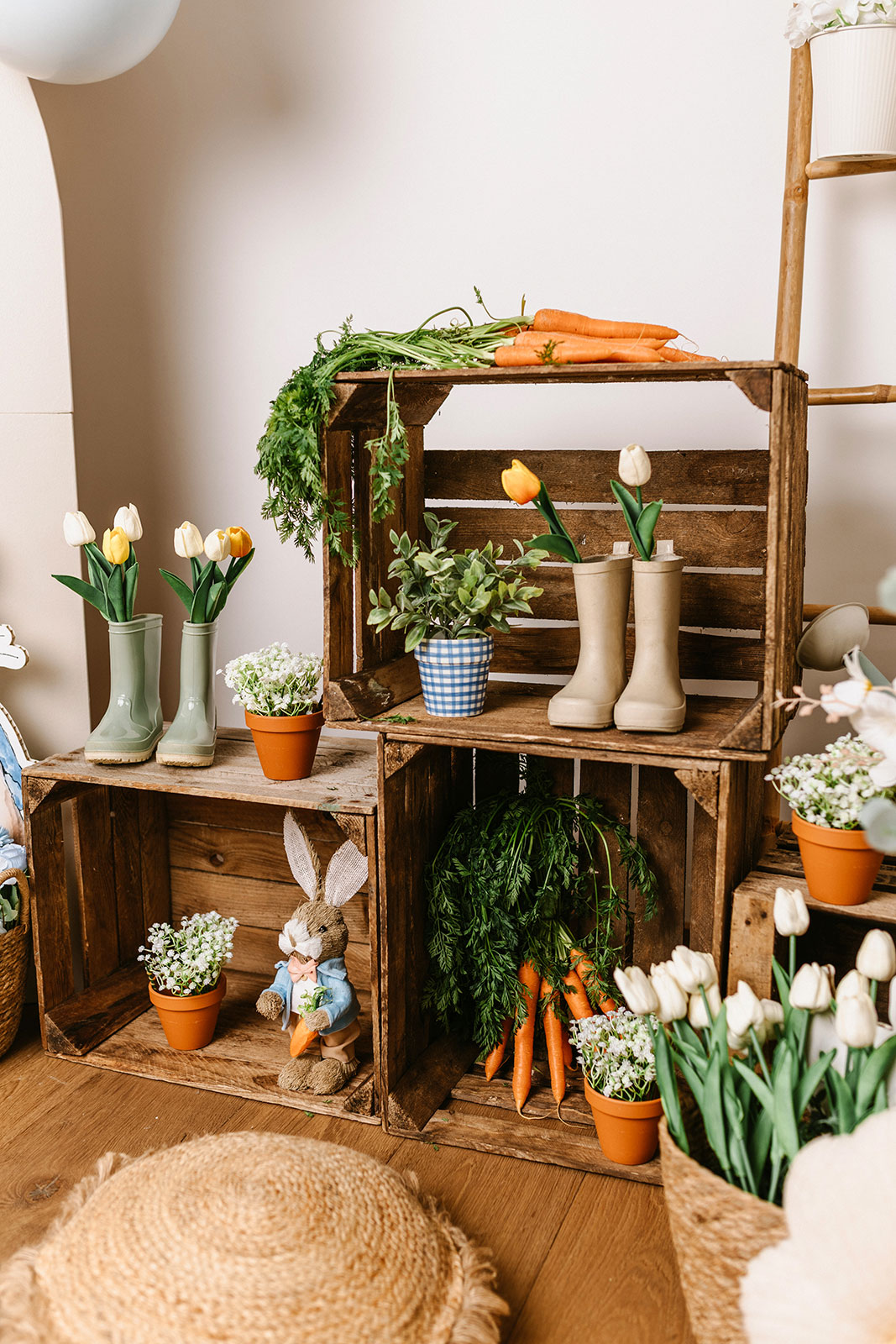 Un décor simple et chaleureux avec des caisses en bois, des tulipes, des bottes, quelques touches de verdure et bien sûr des lapins et des carottes pour rappeler l’esprit de Pâques.